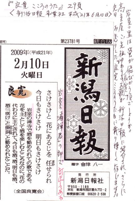 以前「良寛さんと高島屋」で紹介した謌のことが「新潟日報」紹介されていて、その後6月10日に出版された「良寛こころのうた」では訂正されているとのお知らせでした。